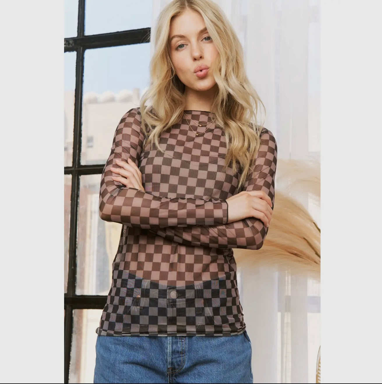 This Sheer Checkered Print Top features a classic crew neck, making it an ideal choice for layering under t-shirts and sweaters. Its lightweight and semi-transparent fabric adds subtle texture without bulk, allowing you to create versatile, polished outfits with ease. Perfect for elevating everyday looks while maintaining comfort and breathability.