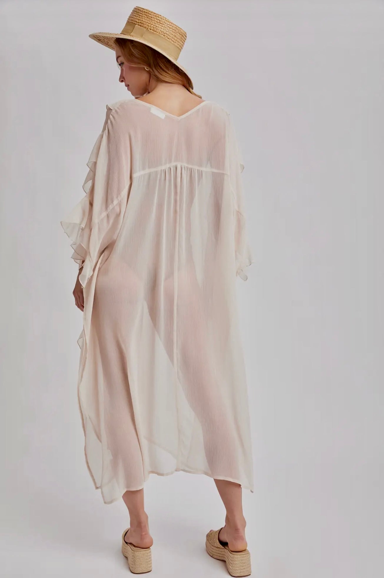 Effortlessly elevate your wardrobe with this sheer ruffle kimono, designed for versatile layering. The open front silhouette drapes beautifully over swimwear, dresses, or casual basics, making it an essential vacation piece. Delicate ruffles add refined texture and movement, while the lightweight fabric ensures breathable comfort in warm weather. Whether you're poolside or exploring coastal destinations, this sophisticated cover-up transitions seamlessly from day to evening wear.